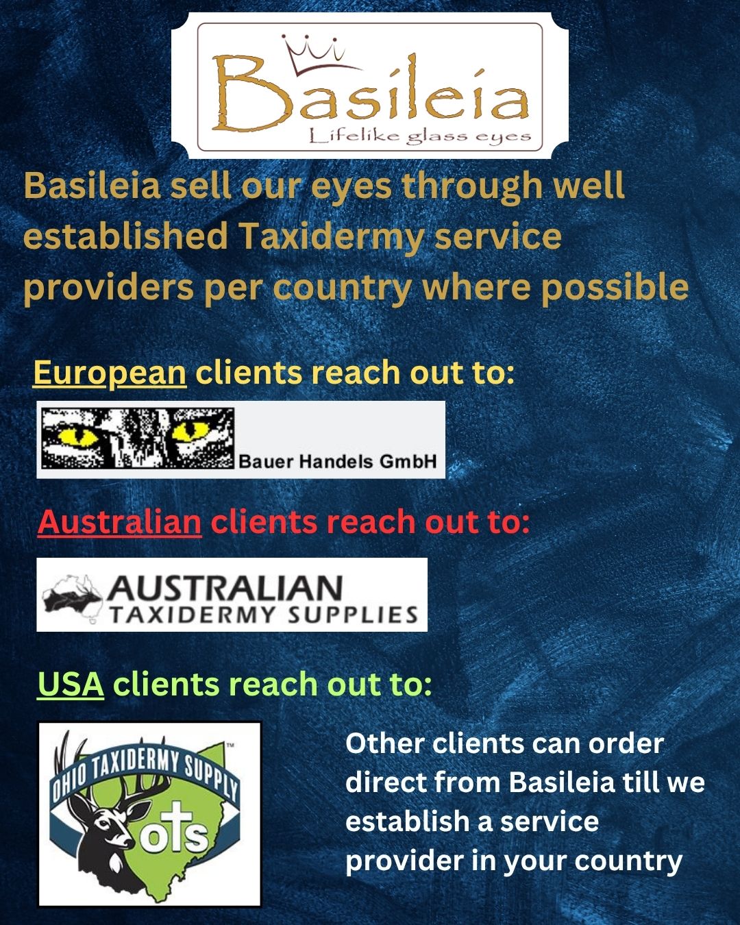 Basileia supply Premium Quality Taxidermy Glass eyes to Professionals across the world!
